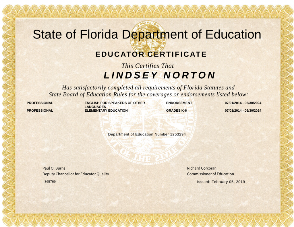 Florida Teaching Certificate with ESOL Endorsement